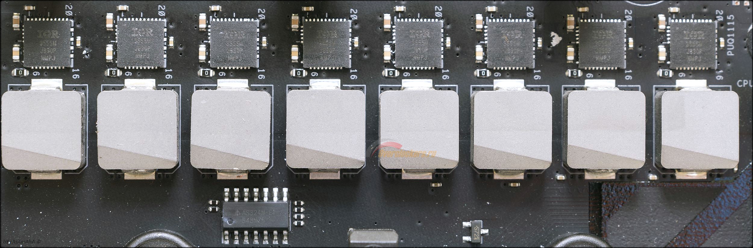 Для меня остается загадкой, почему ASUS в Hero для Intel использует в 1.5 раза менее мощную систему питания для процессоров, потребляющих более 300 Вт, а здесь мы видим банальный «overkill» по питанию для менее мощных процессоров! Что это – работа над ошибками или ASUS решила заранее подготовить плату для экстремального разгона? Скорее второе, судя по наделенным фишкам ASUS ROG Crosshair VIII Hero, но вернемся к VRM и рассмотрим его внимательно.