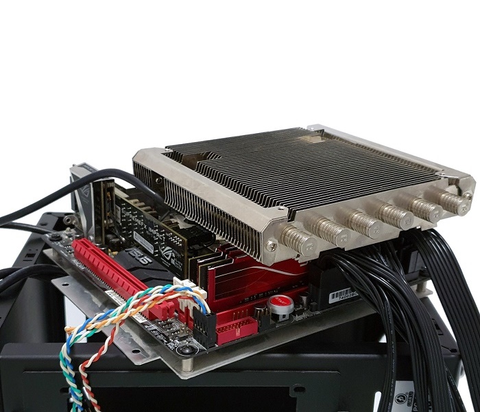 Однако с установленным, хоть и низкопрофильным, но крупным кулером, а также всеми подключенными кабелями запихнуть поддон с материнской платой обратно в корпус оказалось не так-то просто.
