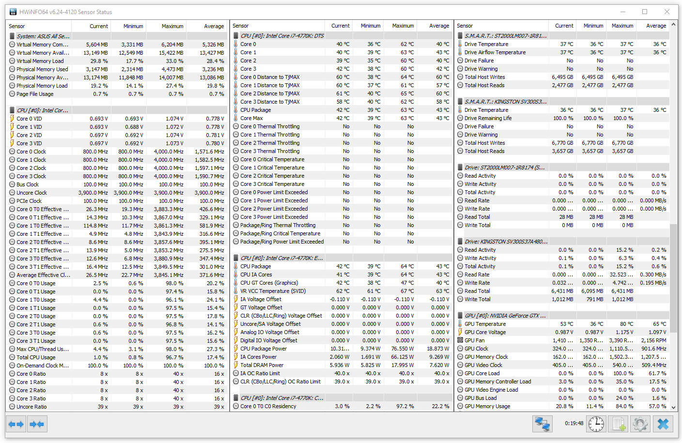 Вот результат часовой записи аппаратного мониторинга при подобной разнообразной нетяжелой нагрузке:
