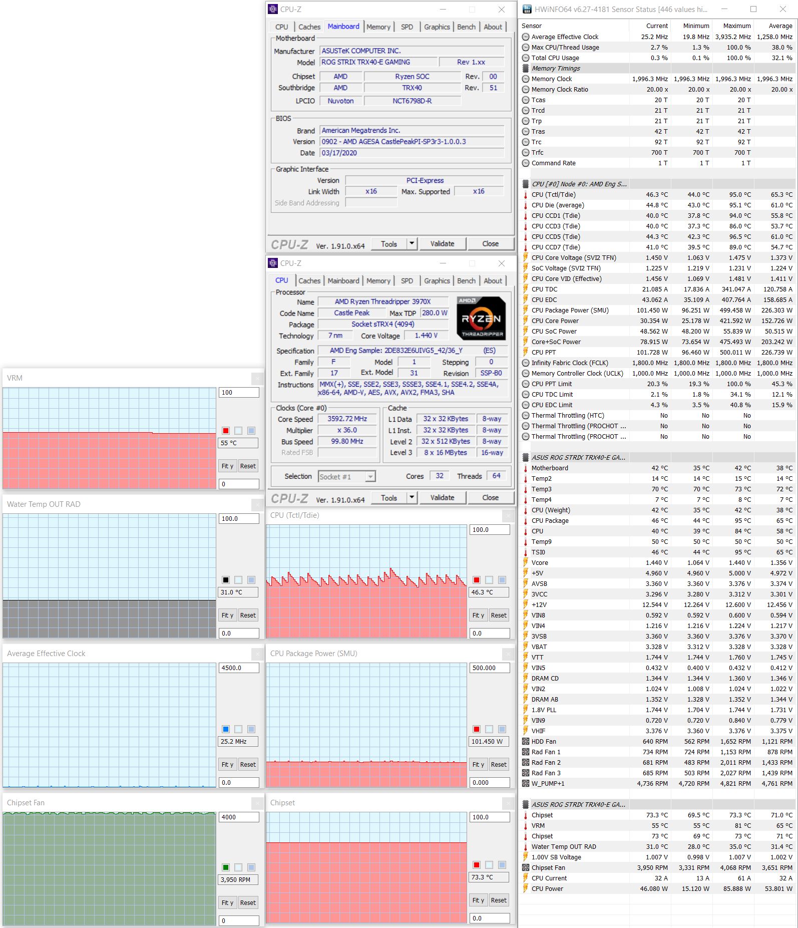 В итоге: 3.9 ГГц на всех ядрах, температура CPU под 95°C, VRM – 81°C, а бедный чипсет – 70°C. Вода в контуре прогрелась до 35°C – это антирекорд, но я абсолютно уверен, что для 64 потоков на частоте 3.9 ГГц феноменальный результат.