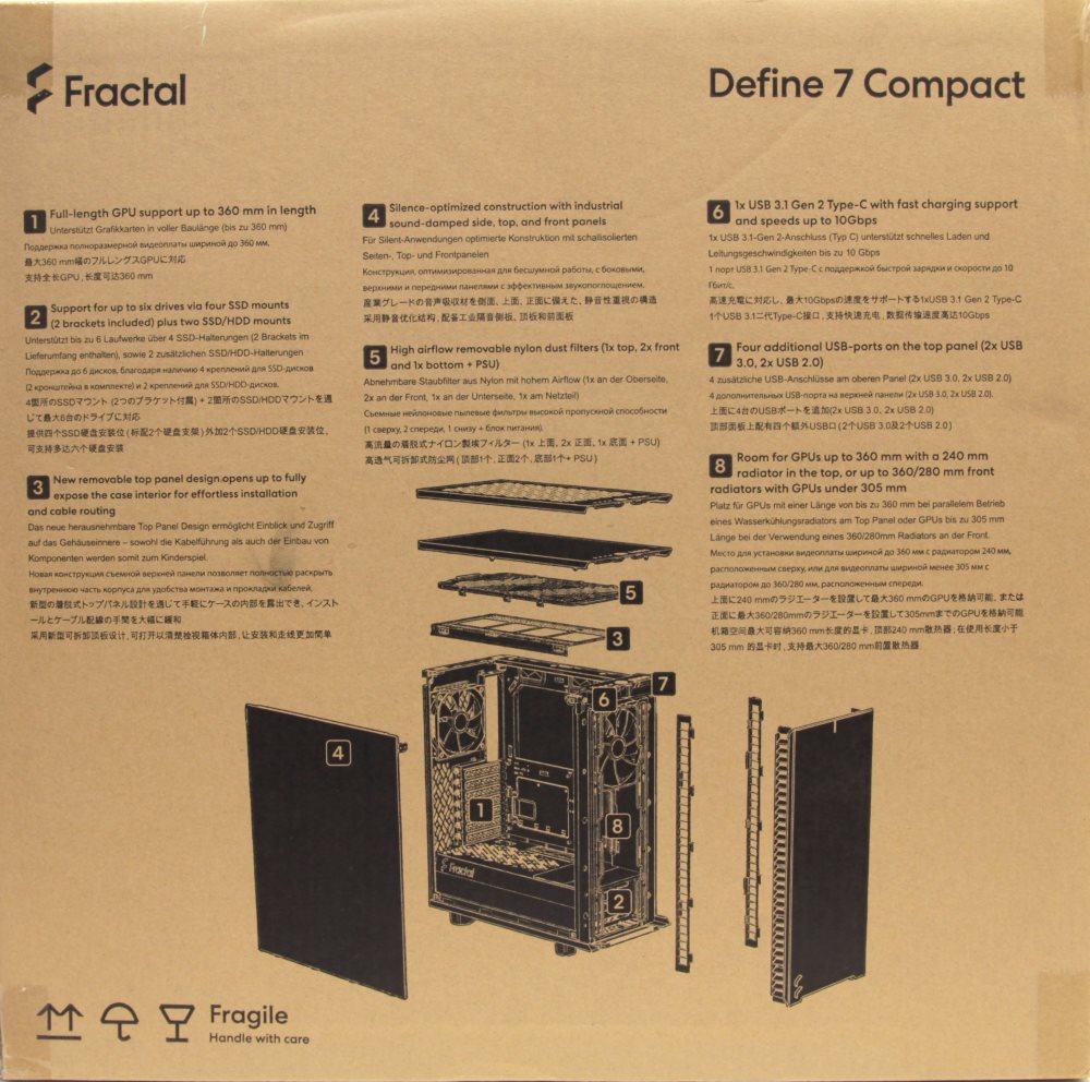 Например, сразу заметно, что боковая панель прозрачная, а передняя просто ровная и на ней ничего нет. Слева от изображения находится спецификация устройства. Она достаточно подробная, роме некоторых параметров. Логотип находится в левом верхнем углу. Теперь из него исчезло слово Design. Ниже находится крупная надпись Define 7 Compact Computer case. Посмотрим на заднюю сторону.