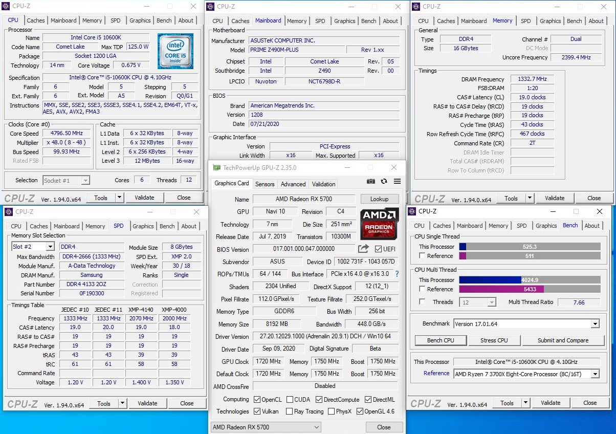 - ASUS Prime Z490-P, Intel Core i5-10600К @ 4600 МГц, память 4133 МГц, тайминги 19-19-19-39-2Т, ASUS TUF Gaming RX 5700.