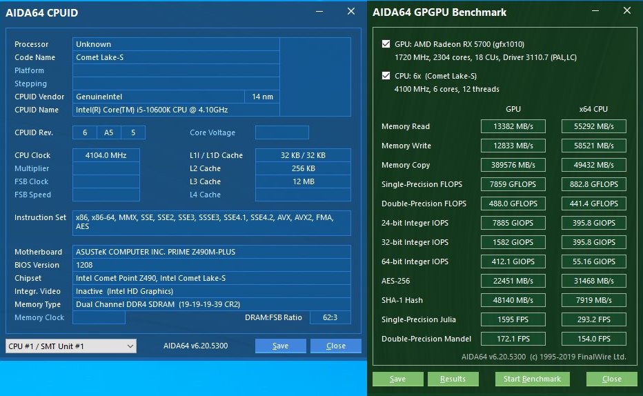 - ASUS Prime Z490M-Plus, Intel Core i5-10600К (4100 / 4800 МГц), память 2666 МГц, тайминги 19-19-19-43-2Т, ASUS TUF Gaming RX 5700;