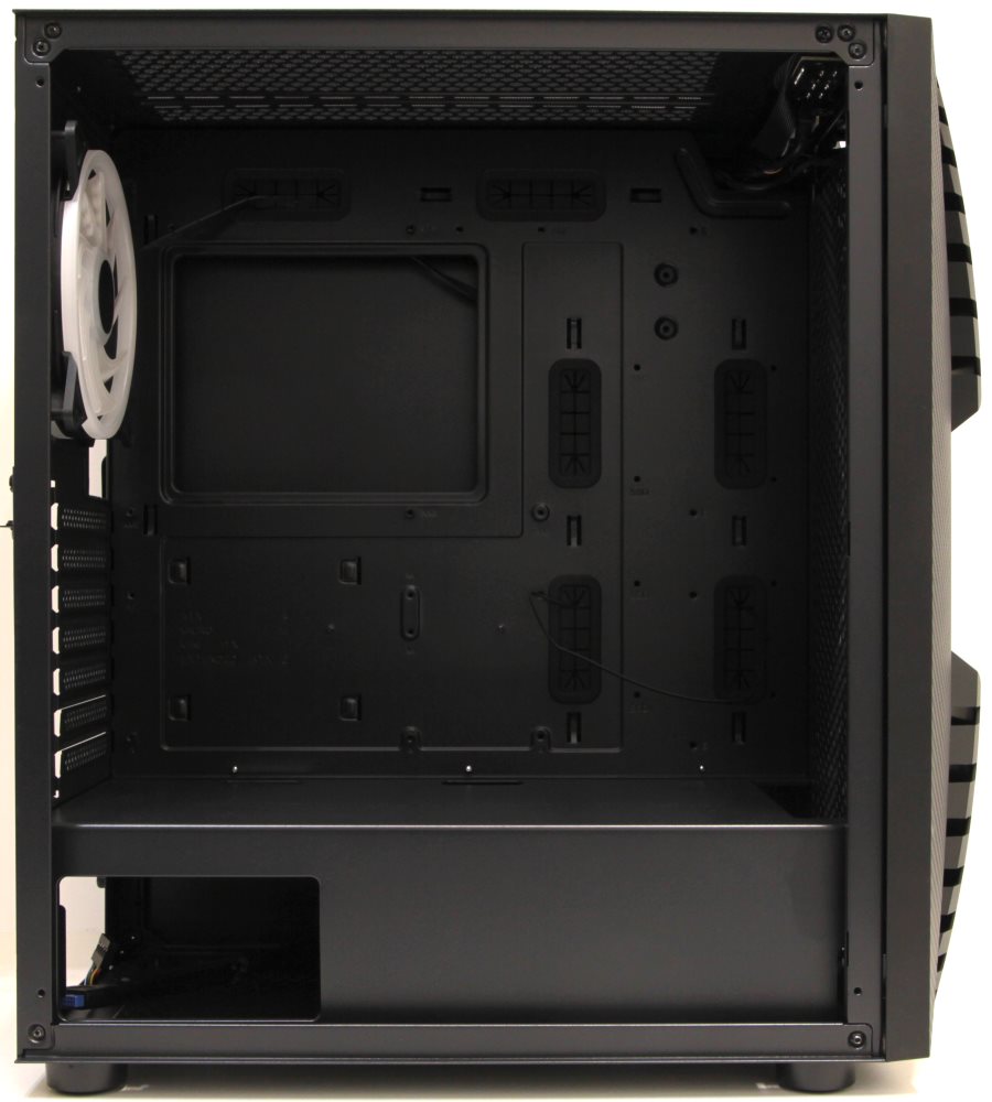 На панели находится три модуля RGB подсветки. Одна лента слева, другая - справа и подсветка логотипа Thunder X3. Вентиляционных отверстий много, а сетки нет. Впрочем, нет и вентиляторов спереди.