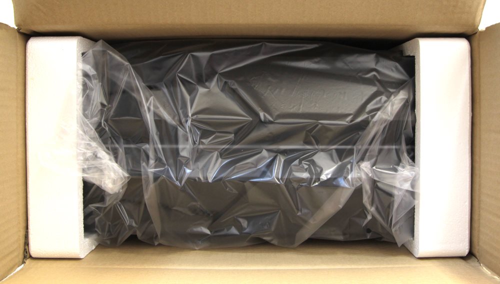 На одной боковой стороне мы видим информацию о комплектации устройства, а на другой просто есть место для транспортировочных наклеек. Открыв коробку сверху, я обнаружил, что корпус расположен передней панелью верх.