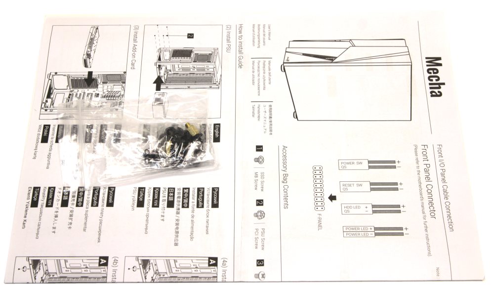 В качестве каркаса используется пенопласт. Статика образуется, но не критично. Извлечение корпуса из упаковки не вызывает проблем. Комплект поставки находится внутри корпуса. Он состоит из небольшой инструкции и пакета с аксессуарами. Инструкцию эту можно изучить непосредственно на сайте компании.