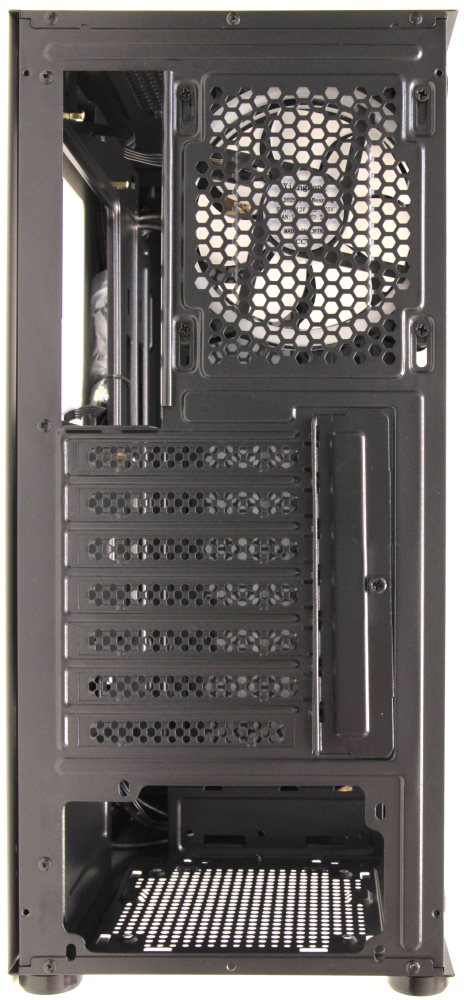 Для начала посмотрим на корпус снизу. Здесь мы ожидали увидеть стандартную стальную сетку, которую компания AeroCool использует в большинстве моделей. Обычно она вставляется в металлические направляющие. Так вот, направляющие есть, а сетки нет. Бюджетный вариант, извините.