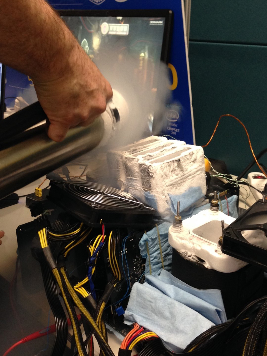 По результатам тестов Splave и 8Pack прошли в финал! Затем эти двое именитых овеклокеров были размещены на финальной сцене в паре метров друг к другу, и вся публика в реальном режиме наблюдала за финальным разгоном двоих криогенных гуру. В первом тесте 3DMark Firestrike, 8Pack показал высокий результат, почти на 50% больше, чем у Splave.