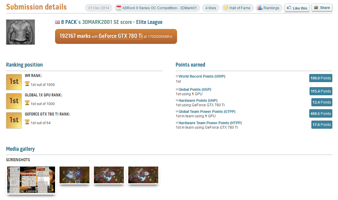 10 апреля 2014 8Pack установил Мировой рекорд в 3DMark11 (PERFORMANCE) набрав 24155 очков. Для достижения такого результата он использовал видеокарту ASUS Matrix GTX 780 Ti охлаждаемую жидким азотом, работающую на частотах 1925/7400 МГц.