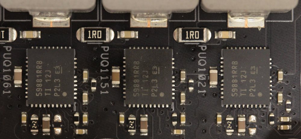 На каждый из 20 каналов приходится по одной ферритовой катушке с технологией MicroFine и по одной транзисторной сборке Texas Instruments CSD59881. Они могут продолжительное время обеспечивать нагрузку 100 А.