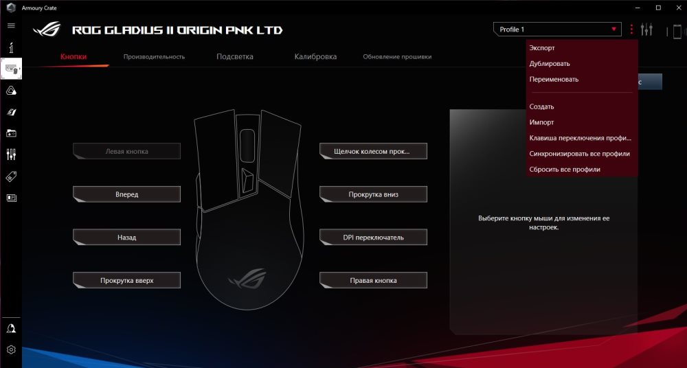 В данном случае мы изучим настройки ASUS ROG Gladius II Origin PNK LTD. Сначала нам предлагают назначить функцию кнопок.