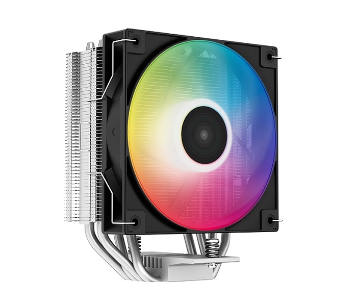 Спереди находится изображение самого кулера, и мы видим, что это классическая односекционная «башня» с одним вентилятором, оборудованным RGB подсветкой. Картинка не передаёт размеров, но конструкция понятна и перекликается с моделью AK400.
