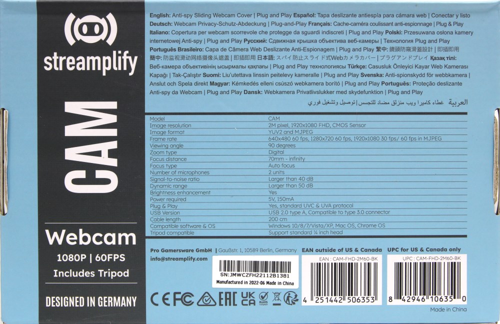 Streamplify CAM поставляется в небольшой коробке голубого цвета. В этом нет ничего удивительного, поскольку обычно веб-камеры небольшие по размеру (и какого-то дополнительного оборудования в комплекте нет). Тут есть небольшой трипод, но он не занимает много места, как штатив или штанга микрофона.