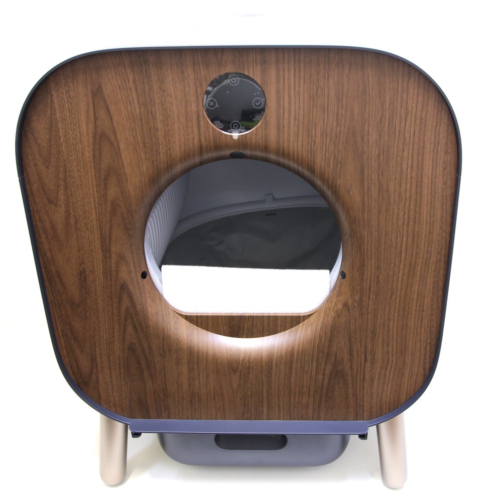 На фронтальной панели находится большой проём для доступа питомца, а сверху от него расположен OLED экран с сенсорными кнопками по краям окружности.