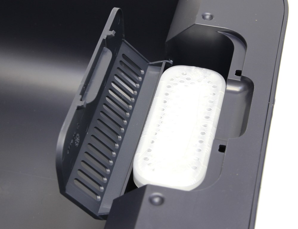 Внизу устройства, аккурат между ножками, находится лоток для отходов. У него есть свой выступ снизу, и он легко снимается. Лоток изготовлен из такого же пластика, как крышка и основание корпуса, его объём составляет 8,6 литров, и производитель заявляет о том, что этого достаточно на 14 дней.