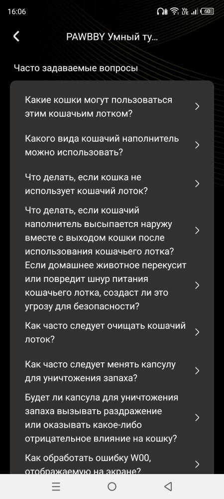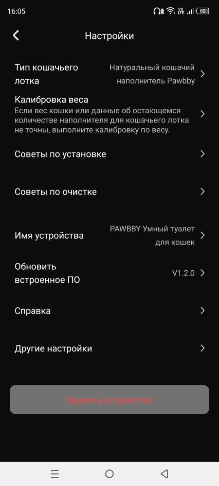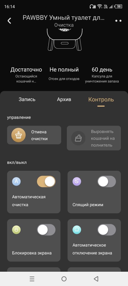 Штатное приложение простое и понятное, есть множество различной вспомогательной информации, подсказок и настроек. Например, можно выравнивать наполнитель вручную, совершать очистку, настраивать время отключения экрана и перевода устройства в спящий режим. Сам экран информативен и позволяет отслеживать вес питомца в реальном времени. По периметру дисплея есть четыре сенсорных кнопки, которые дублируют часть функций (если смартфона нет под рукой), а ещё они позволяют подключить лоток к беспроводной сети.