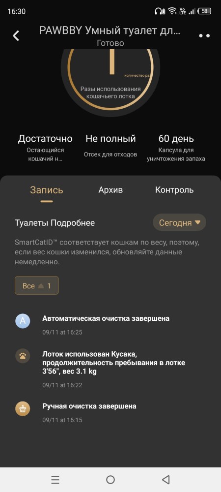 Также на экран выводятся различные предупреждения и уведомления. Например, сообщается о том, что пора убрать мусор, заменить поглотитель запаха, открыта верхняя крышка, выдвинут нижний лоток и т.д. Про вес я уже говорил, он также отображается на экране, когда пушистик делает свои дела.