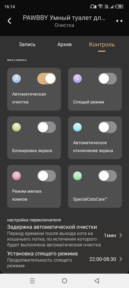 Через приложение осуществляется много настроек по работе экрана. Например, есть пункты по настройке времени отключения дисплея и перехода устройства в спящий режим. Также есть функция SpecialCatsCare, для кошек которым нужен особый уход. При этом отключается функция самоочистки. Ещё есть режим «мягких комков», для этого барабан совершает 4 колебания в разные стороны, чтобы отходы затвердели получше.