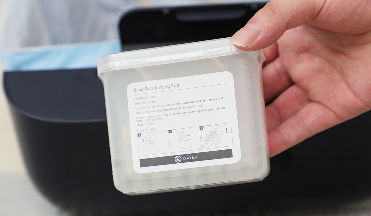 Для устранения неприятных запахов в нижний отсек лотка устанавливается картридж с дезодорантом. В программном обеспечении предусмотрена функция напоминания о его замене. Для этого достаточно выдвинуть нижний лоток, открыть небольшую крышку, извлечь старый контейнер и установить новый. Вся процедура осуществляется достаточно просто. В качестве сырья для устранения запахов и дезодорации используются натуральные растения, адсорбирующие аммиак, содержащийся в кошачьей моче. Вещество обладает сильной дезодорирующей способностью, абсолютно безвредно для здоровья кошек и людей.