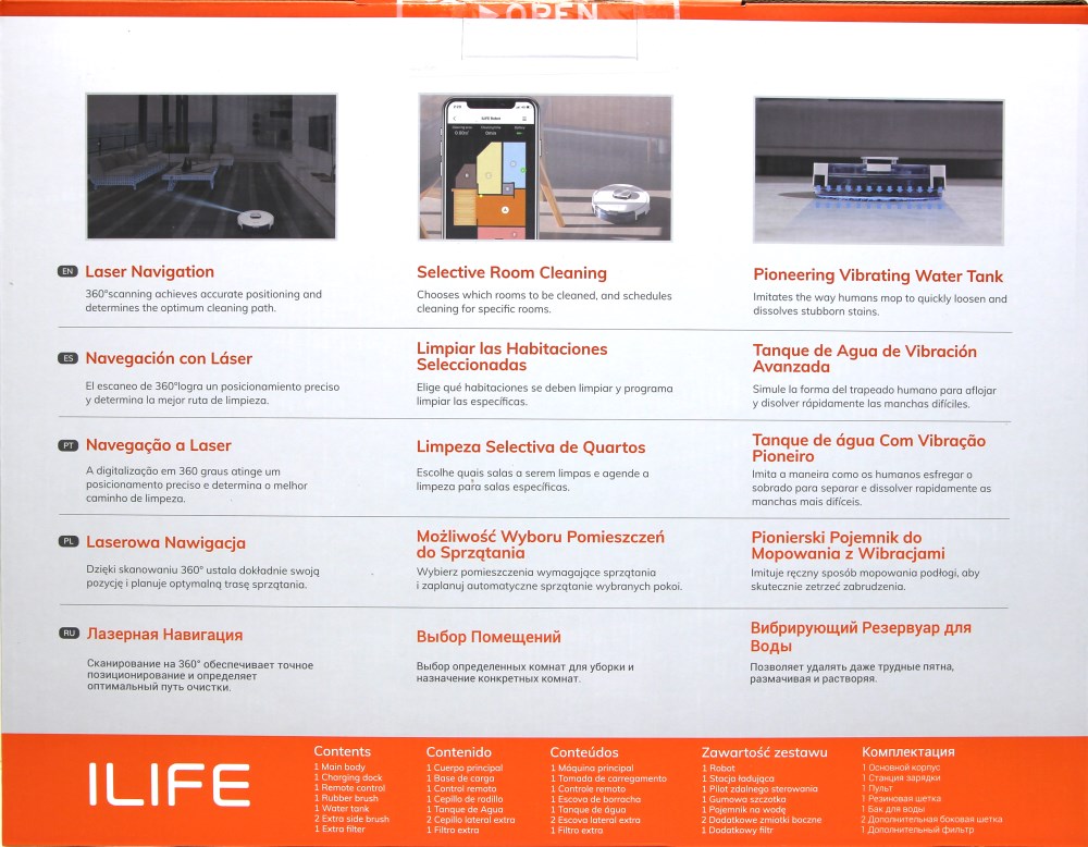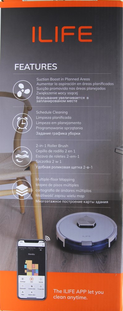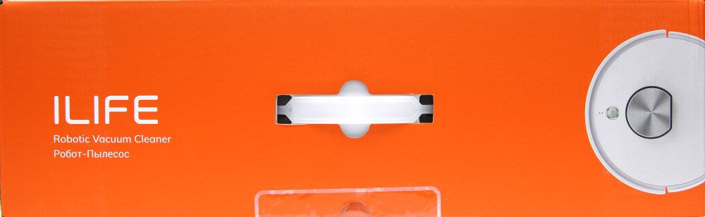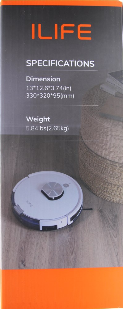 Спереди мы видим крупное изображение робота-пылесоса сверху и небольшой фрагмент с обратной стороны. В самом низу проходит оранжевая полоса и на ней белыми крупными буквами обозначено название компании ILIFE. Это известная фирма на рынке роботов-пылесосов и у неё есть модели-бестселлеры. Кстати, название модели указано крупными символами оранжевого цвета в левом верхнем углу. Ниже указано, что устройство оборудовано лазерной навигацией и то, что это вакуумный пылесос.