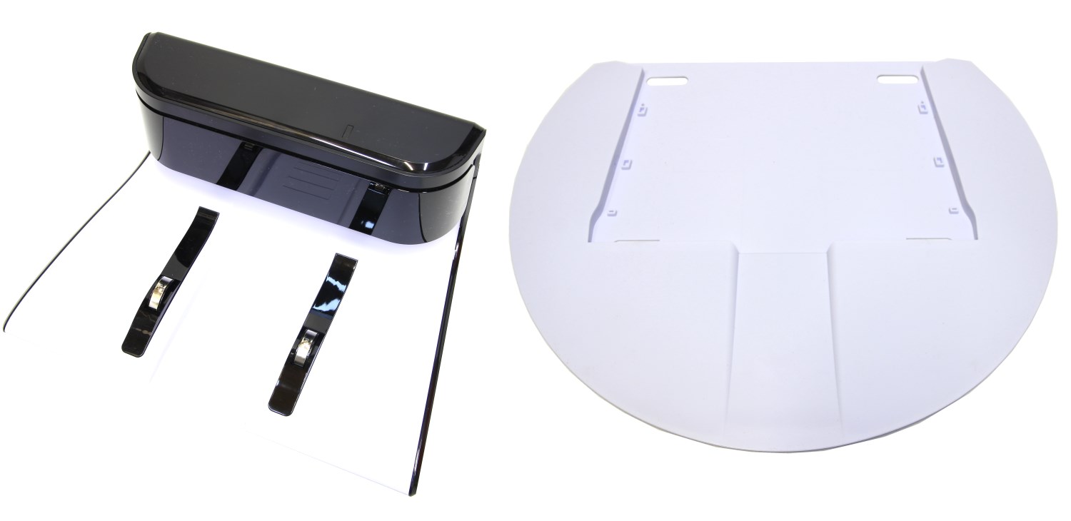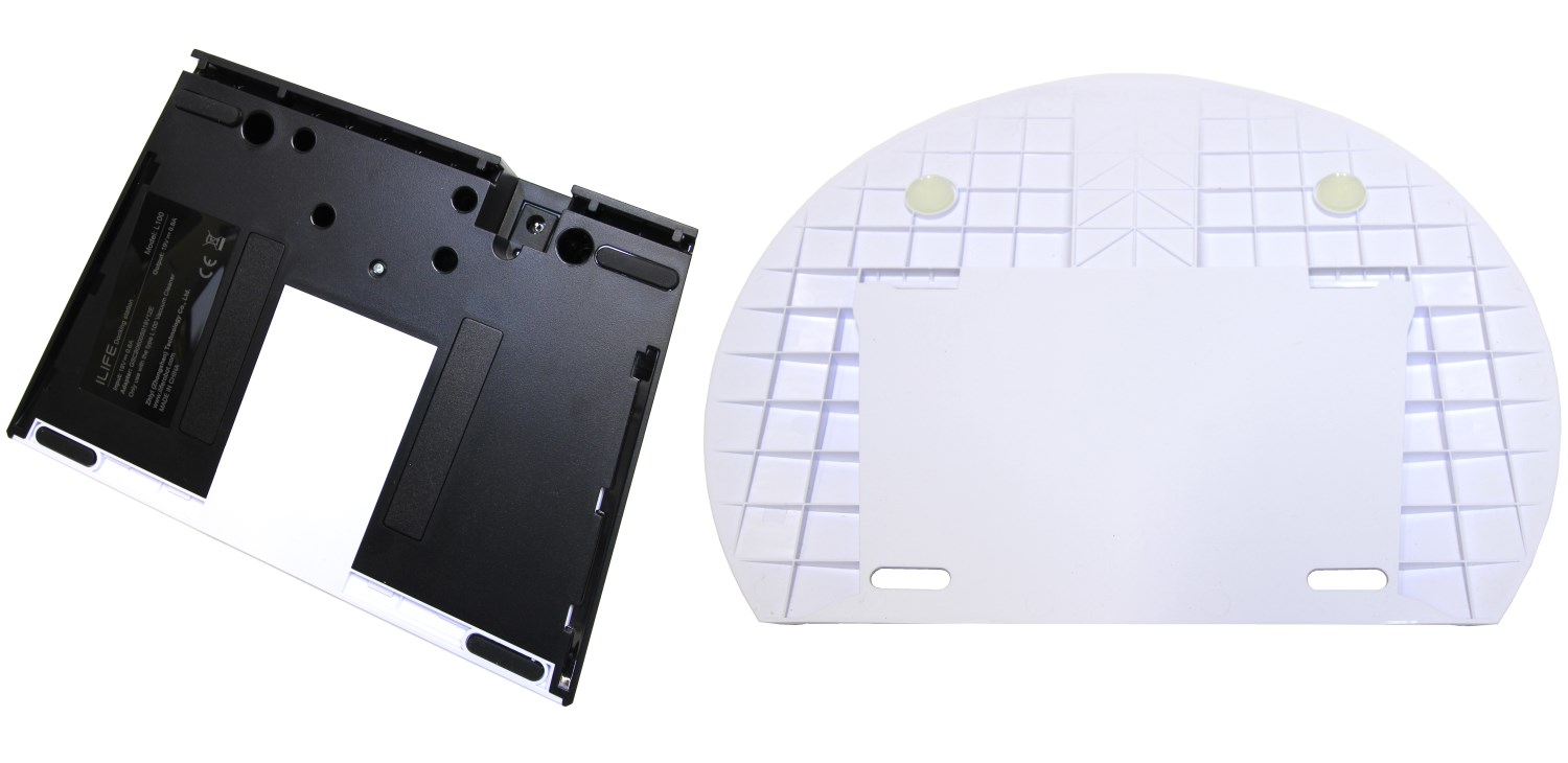 Для начала можно обнаружить пластиковую белую крупную пластину, которая служит подставкой. Это площадка для базы подзарядки, а эта пластиковая деталь служит для размещения на ней устройства с влажной шваброй.