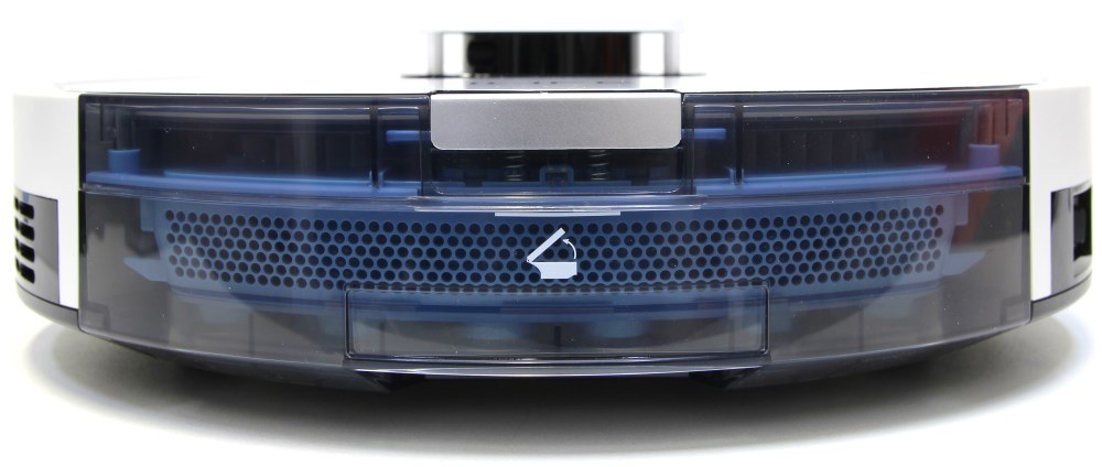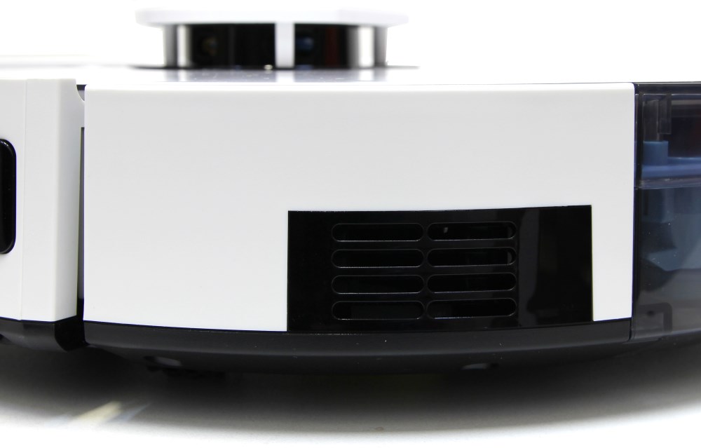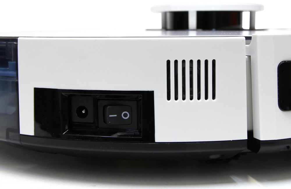Корпус изготовлен из прочного пластика. В передней части находится бампер с сенсорами столкновения. Тут алгоритм понятный, отмечу лишь, что устройство настроено достаточно агрессивно и может даже сдвинуть стул. Корпус достаточно крепкий. Верхняя поверхность глянцевая. По бокам тоже есть глянцевые пластиковые вставки. Например, в месте выхлопа воздуха или расположения переключателя питания с разъёмом питания.