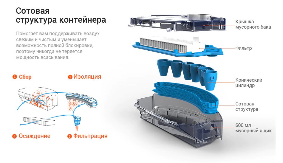 Пыль и частицы оседают в контейнере. Он легко открывается и его можно спокойно вытрясти, а в самом конце уборки промыть. Не нужно мочить только специальный фильтр сверху, но там есть предупреждающая надпись.