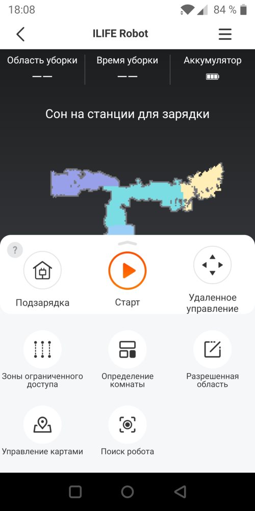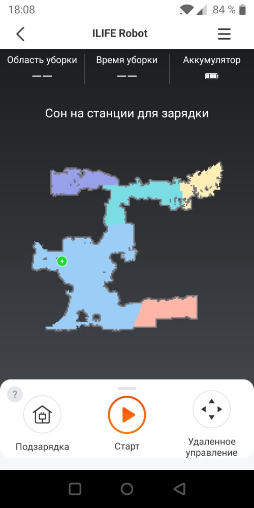Далее мы видим карту, где разным цветом выделены различные помещения. Внизу находится три кнопки, а ещё ниже можно раздвинуть меню вверх. Значков сразу становится больше. Первая кнопка «Подзарядка» отправляет устройство на базу для осуществления зарядки. Далее находится кнопка «Старт», которая запускает пылесос на уборку. Предусмотрено и дистанционное управление, чтобы вручную направлять устройство.