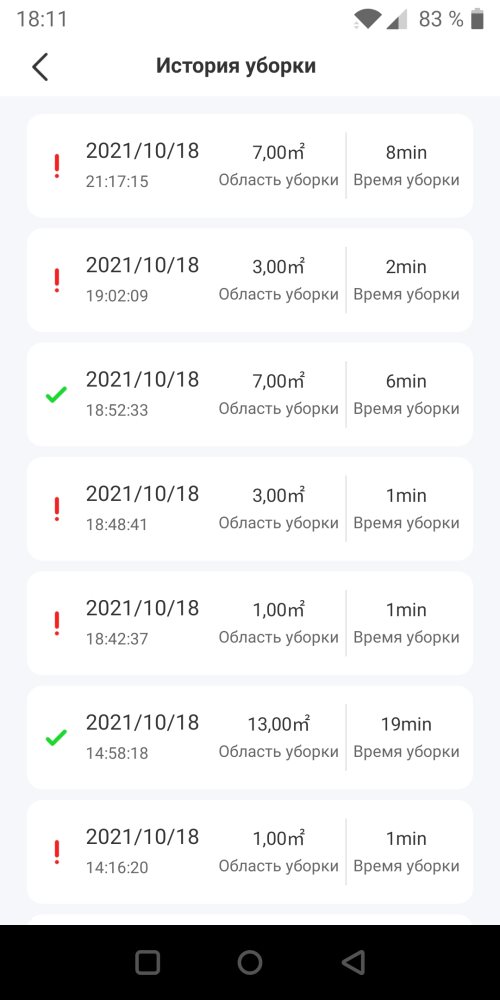 В верхнем правом углу находится меню настроек. К нему мы вернёмся позднее, а пока рассмотрим другие функции. Ниже находится строка состояния, где отражается текущая площадь уборки, время уборки и заряд аккумулятора.