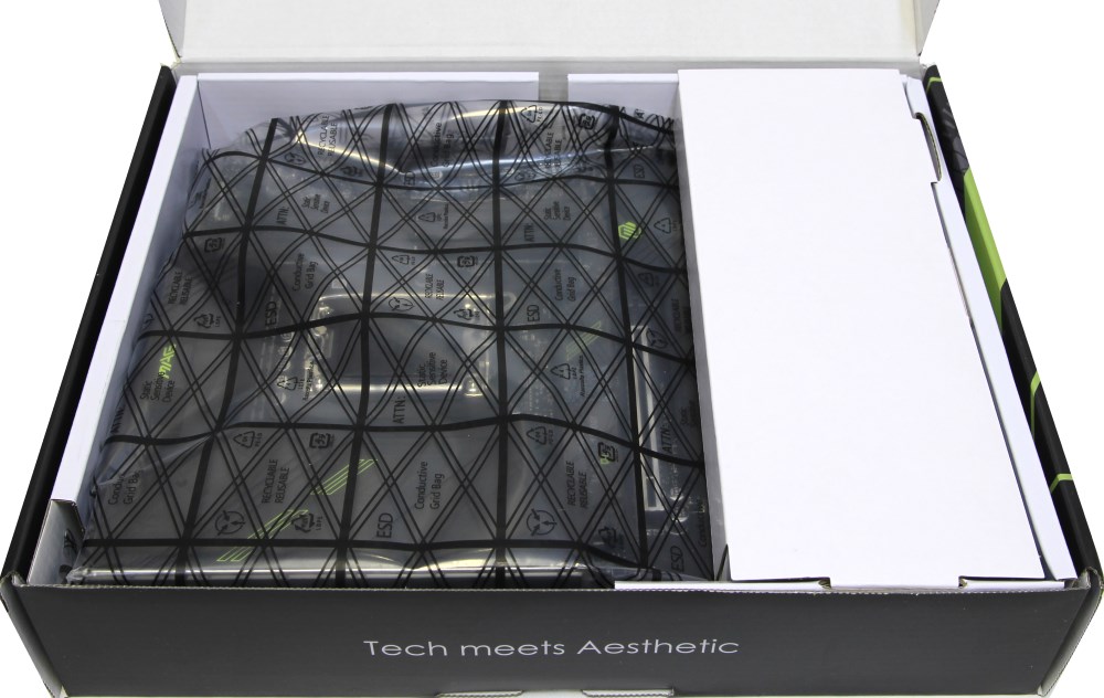 В левом верхнем углу находится эмблема серии Gaming и надпись Next Gen CPU Ready, а в правом верхнем углу – два значка компании Intel. Далее мы видим зелёные и серые полосы. По центру крупными символами указано наименование модели. Фон матовый, полиграфия хорошая и в целом всё выглядит неплохо.