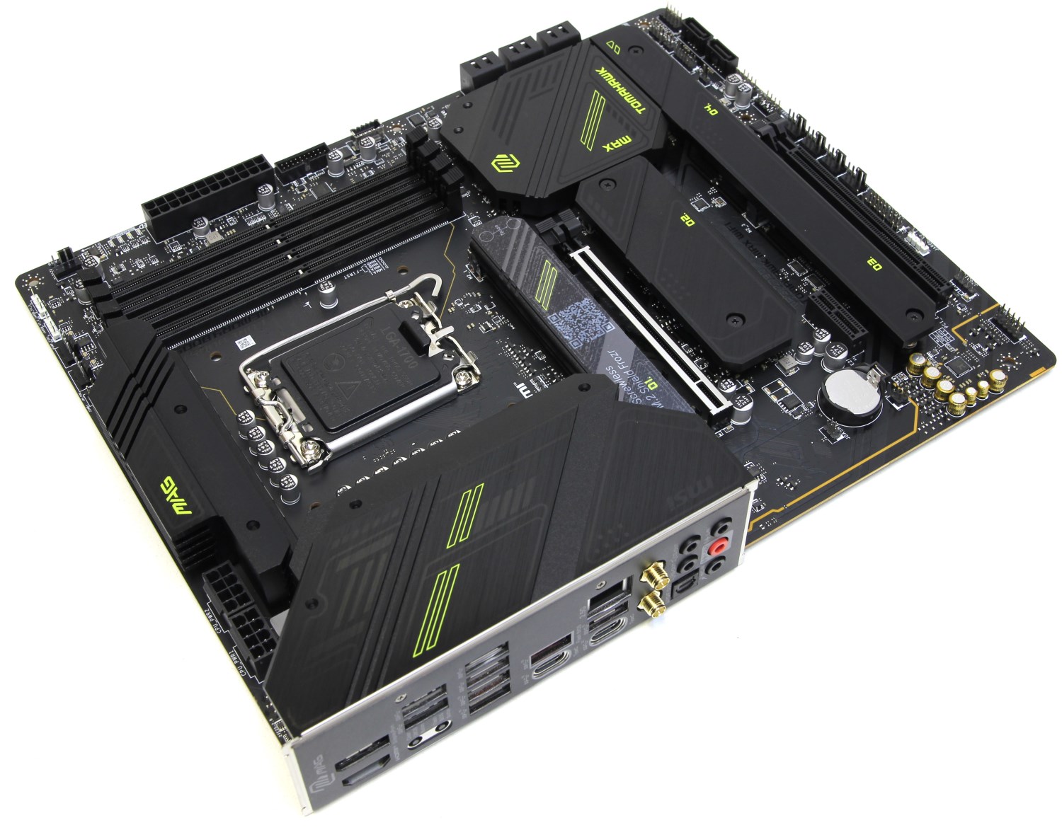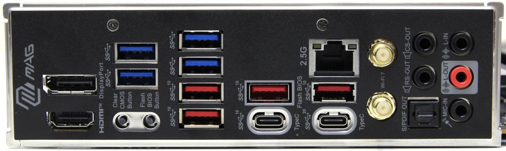 Это флагманская модель в своей линейке MAG. Мы видим развитую систему охлаждения, а над разъёмами задней панели расположен не кожух, а продолжение бокового радиатора.