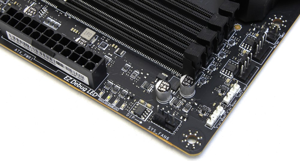Рядом с основным коннектором питания ATX находится группа из четырёх светодиодов, которые показывают прохождение загрузки и инициализации процессора, памяти, видеокарты и накопителя.