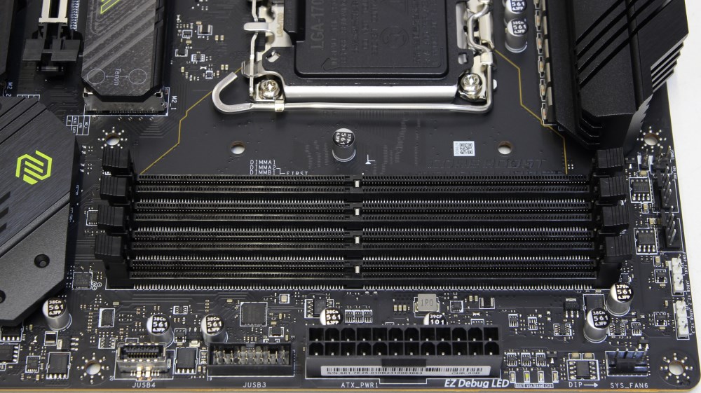Заполнять слоты модулями рекомендуется, начиная от правого края платы или дальше от сокета. Производителем заявлена поддержка режимов работы от DDR5-4800 до 7800 МГц со штатным напряжением 1.1 В, которое можно увеличивать. Максимальный допустимый объём 192 Гб достигается путём установки четырёх модулей по 48 Гб.