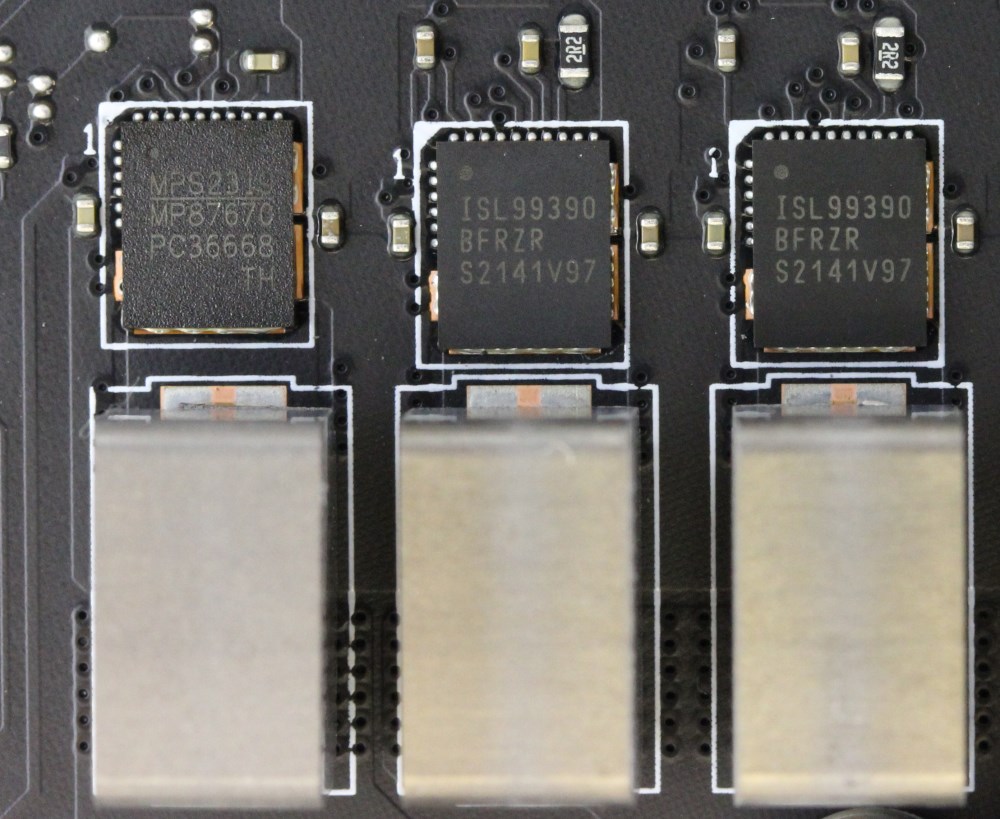 На каждый из 16 каналов приходится по одной ферритовой катушке индуктивности и по одной транзисторной сборке Intersil ISL99390, которые обеспечивают по 90 А.