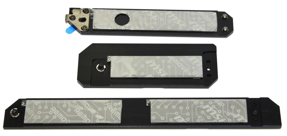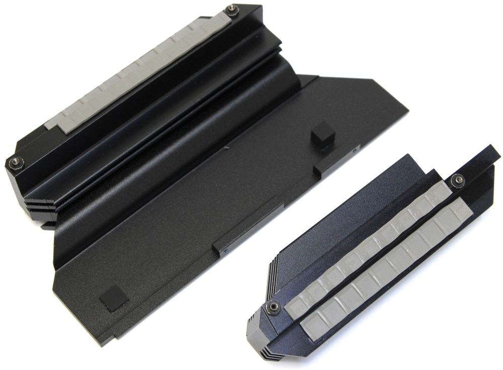 Радиаторы для SSD накопителей изготовлены из алюминиевого сплава и окрашены в чёрный цвет. Сверху указаны ярко-зелёные цифры. На каждом присутствует терморезинка для улучшения контакта и теплопроводности, а также два винта для крепления к втулкам на плате. Один винт остаётся, а другой вынимается, что очень удобно при монтаже.