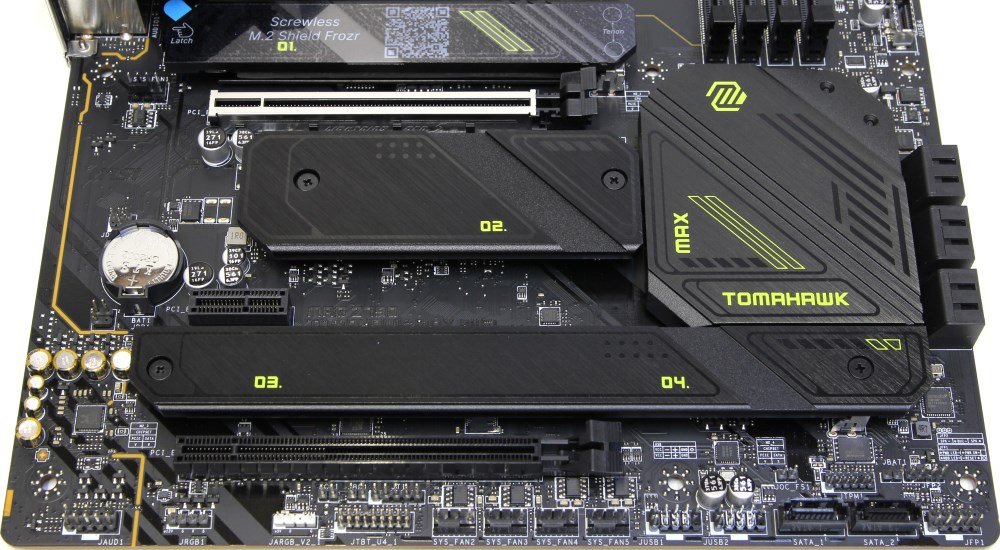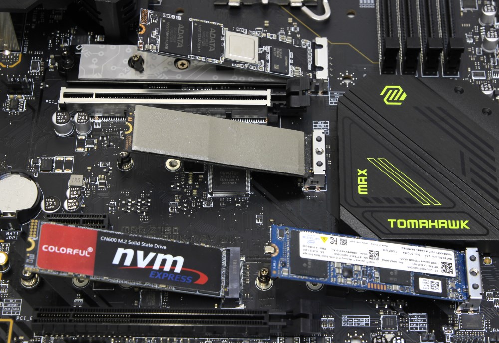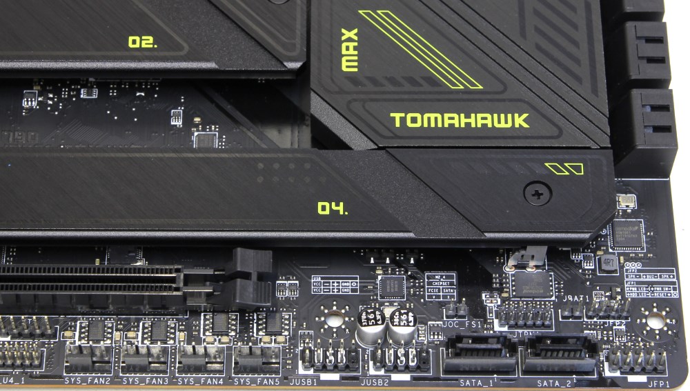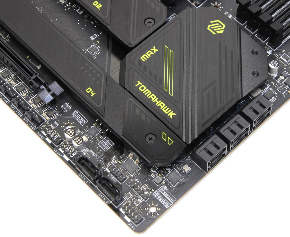 Сама плата тёмно-коричневая, принтов мало, радиаторы чёрные, надписей не так много. Только на радиаторе чипсета написано MAX и Tomahawk. Если бы две платы лежали рядом без радиаторов, то мне бы оставалось только угадывать, а наверняка я бы не понял, при том, что плат уже посмотрел много всяких.