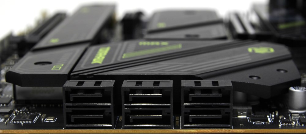 В данном случае реализовано восемь портов SATA 3, но два из них при помощи отдельного контроллера ASMedia ASM1061. Шесть выведено вбок, а два расположены внизу.