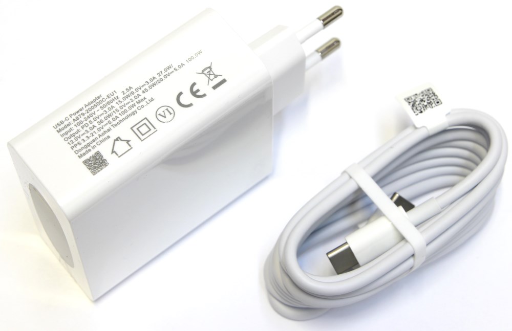 Там же в отсеках каркаса пенопласта лежит блок питания и соединительный кабель USB Type-C - USB Type-C. Блок питания тоже как у смартфона, но на 100 Вт. Он также в плёнке.