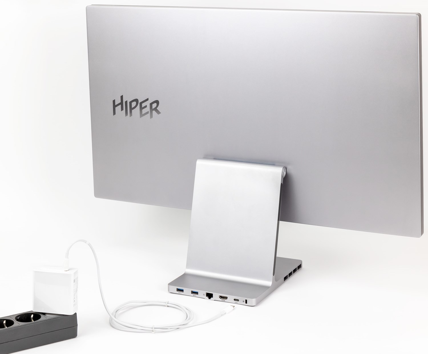 Задняя панель изготовлена из анодированного алюминия и на ней находится крупная надпись HIPER. Поверхность ровная, матовая, гладкая. Нет никаких портов и разъёмов. Все они размещены на подставке. С точки зрения прокладки кабелей и эстетики так даже лучше и я с таким сталкиваюсь впервые.