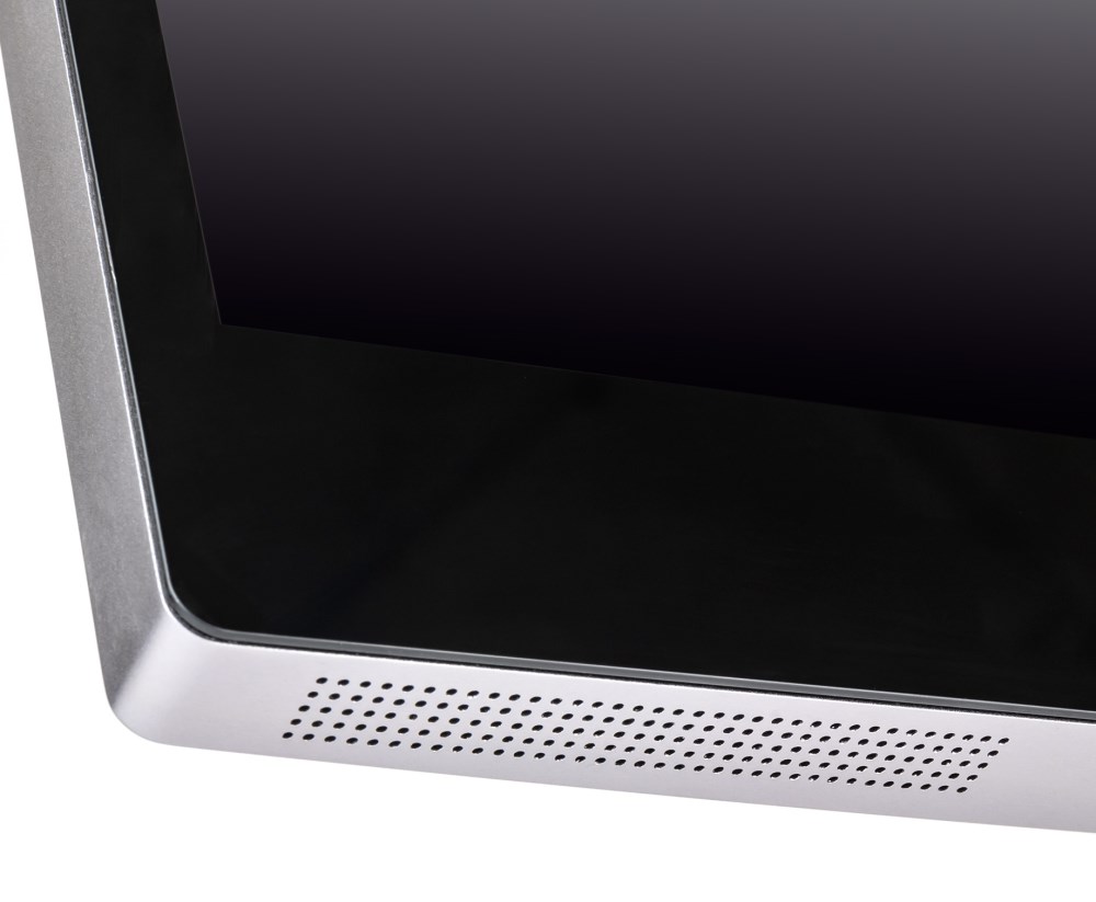С верхнего и боковых торцов ничего нет, а вот снизу есть отверстия двух динамиков. Они спрятаны так, что их практически не видно, если специально не заглядывать вниз на нижний торец. Ножка (стойка) сделана тоже очень изящно. Между корпусом экрана и ней можно заметить шарнир наклона. Здесь он очень мягкий и легко регулируется.