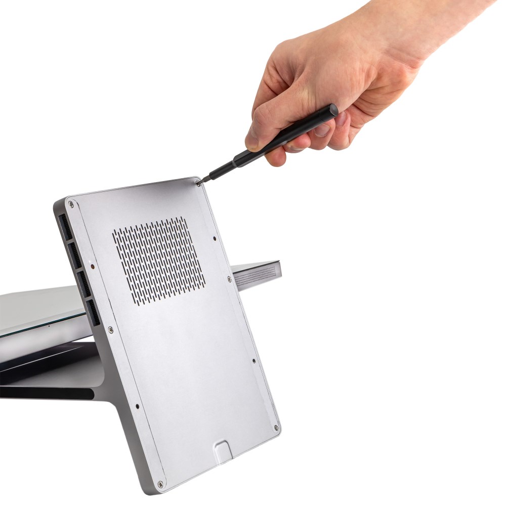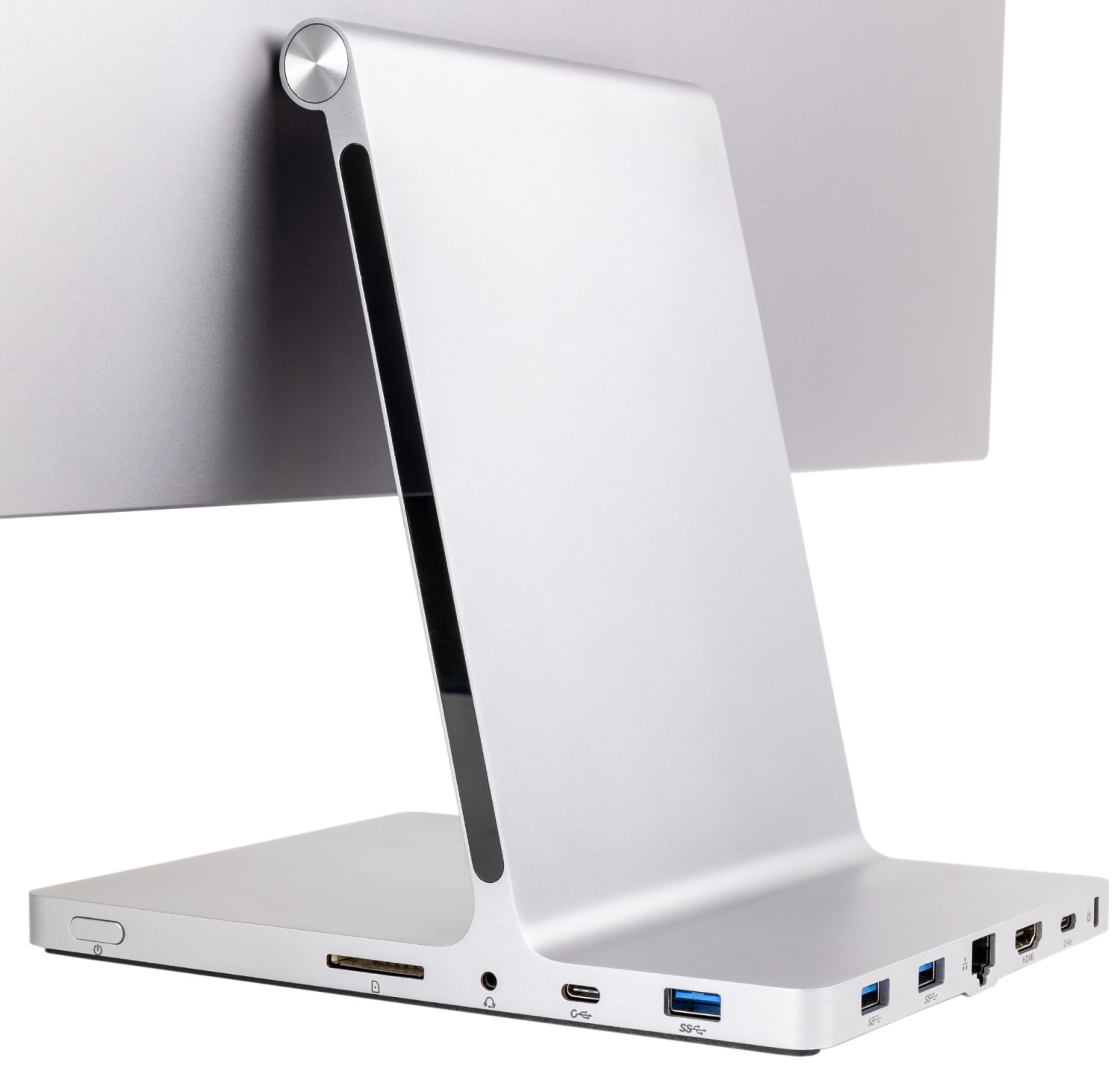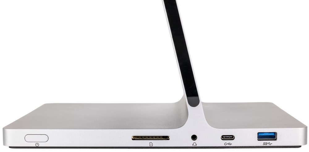 Корпус и все основные элементы конструкции изготовлены из анодированного алюминия. Сделано всё качественно и аккуратно. Единственное, корпус экрана мог бы быть тоньше, поскольку системная плата размещена в нижней подставке. Зато благодаря немалому весу экрана очень плавно работает шарнир наклона. Кроме того, устройство смотрится монументально, создавая иллюзию надёжности и высокой мощности. Кстати, производительность достаточно хорошая, благодаря двум производительным ядрам и восьми энергоэффективным. Кратковременно процессор может выходить на потребление больше 30 Вт. Система охлаждения с этим справляется.
