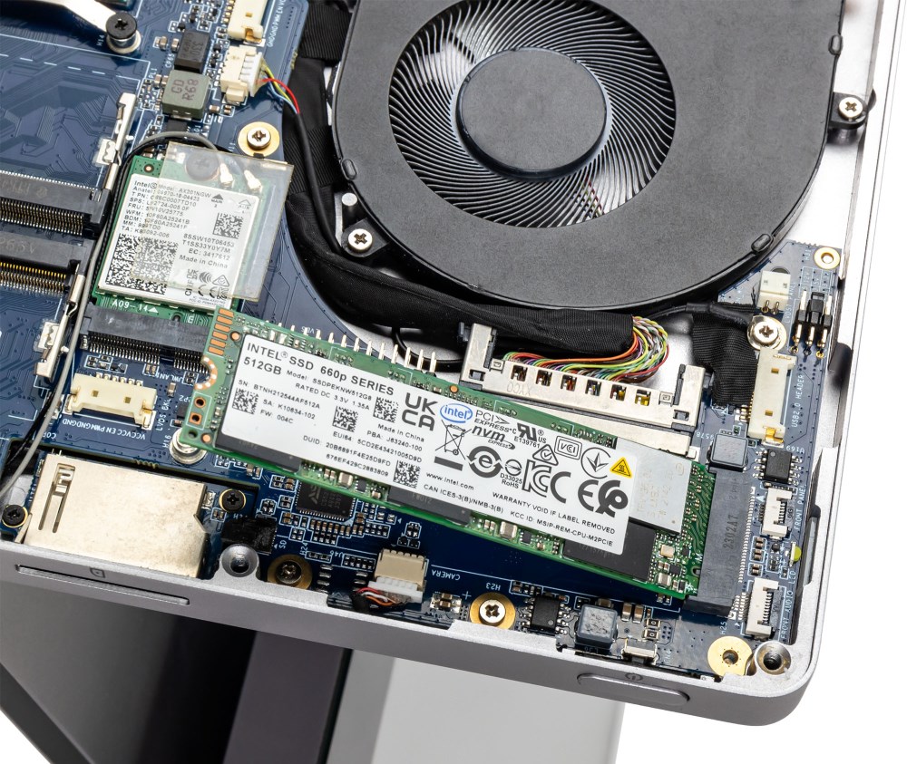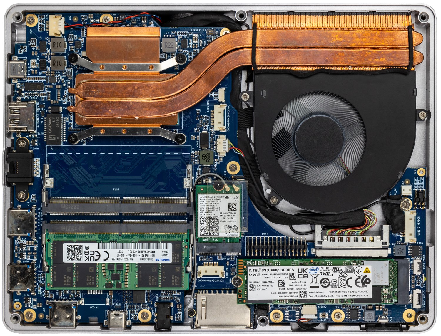 Память типа SODIMM DDR5 устанавливается в два слота. В моём случае это был один модуль на 16 Гбайт DDR5-4800 производства компании Samsung. Процессор поддерживает режимы до DDR5-5200, а в BIOS есть функции разгона. Однако где искать ClrCMOS, если что-то пойдёт не так? Придётся снимать плату. Ведь батарейка установлена с другой стороны, что не очень удобно, но справедливости ради просто нет свободного места. Нужно же ещё разместить накопитель и беспроводной модуль. Последний тоже сделан съёмным, чтобы его можно было заменить.