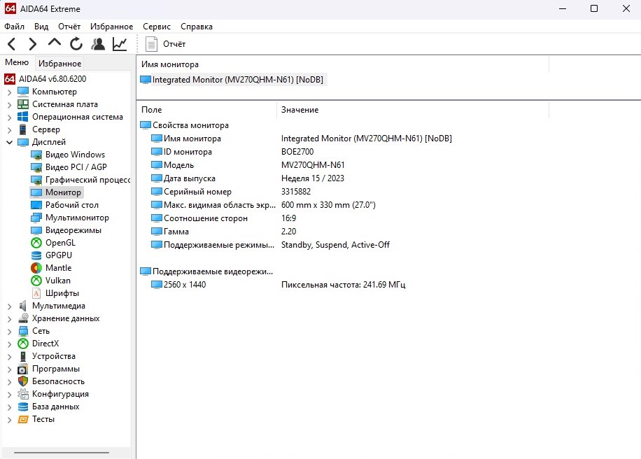 Экран с диагональю 27 дюймов обладает разрешением QHD (2560 х 1440) точек – наиболее оптимальный вариант для данного размера. Зерно на таком экране уже становится не так заметно, но разрешение позволит очень комфортно работать. Здесь используется матрица BOE MV270QHM-N61.