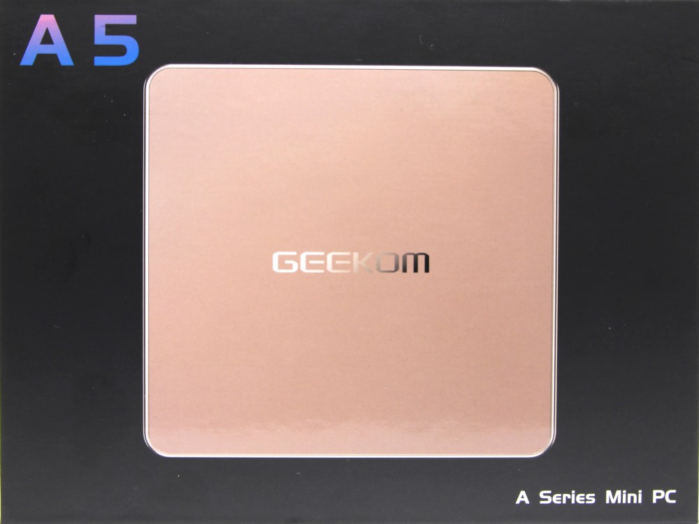 Оформление достаточно простое и лаконичное. Спереди мы видим крупную надпись A5 в левом верхнем углу. Логотип производителя Geekom находится с торцов и прямо на центральной фотографии, которая демонстрирует верхнюю крышку устройства. С обратной стороны фон сильно отличается, есть несколько наклеек с штрихкодами, а также различной информацией. На одной из них указана конфигурация устройства.