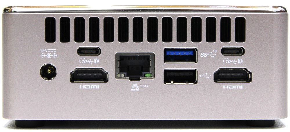 Мы видим два HDMI 2.0b, два USB 3.2 Gen2 Type-C с возможностью вывода изображения через Display Port, один USB 3.2 Gen2 Type-A, один USB 3.2 Gen2 Type-C, 2.5G Ethernet и разъём питания. Набор отличный.