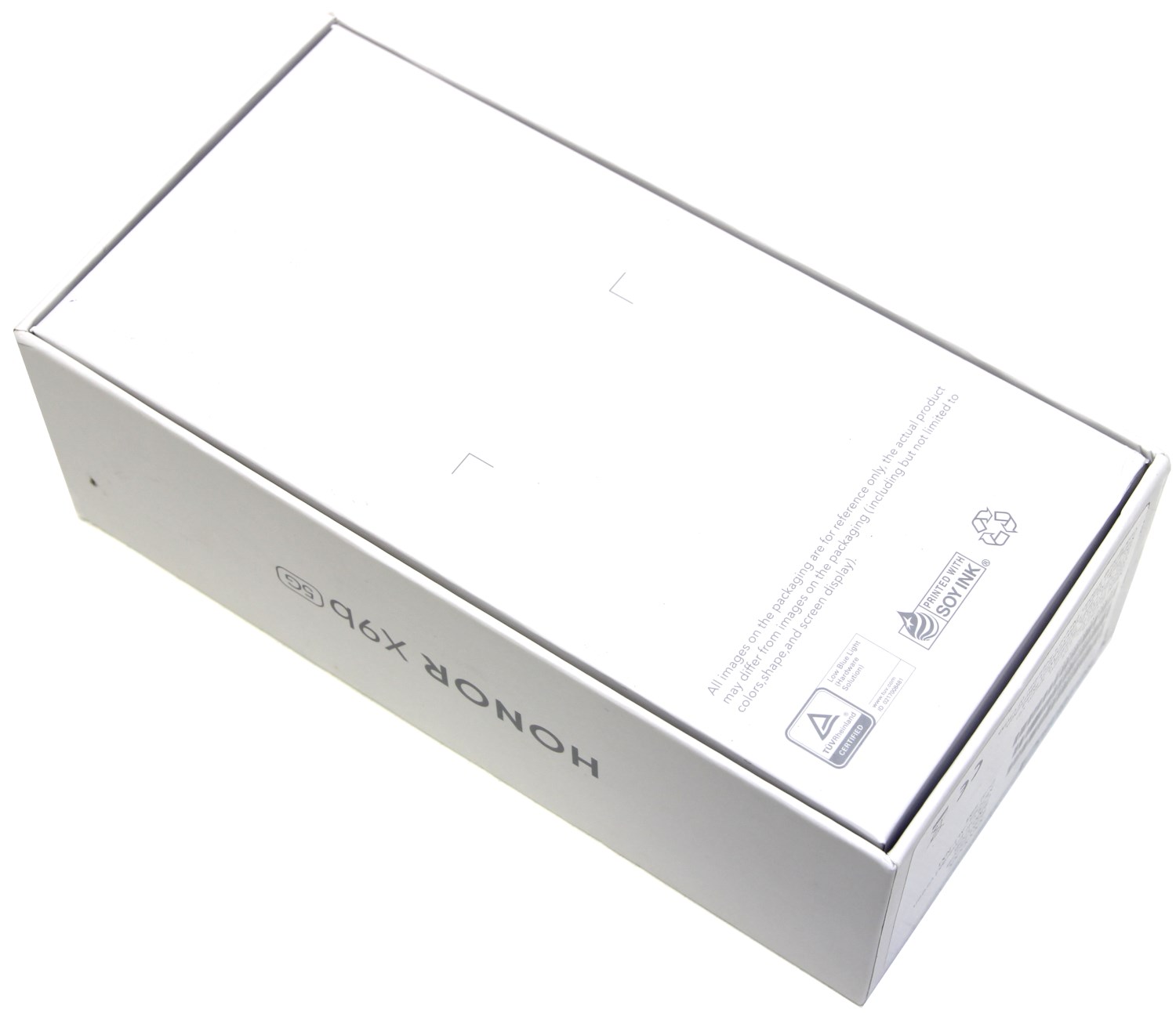 На нижнем торце наклейка со спецификацией на английском языке. Тыльная сторона коробки белая и совершенно пустая, за исключением значка переработки и использования соевых чернил.