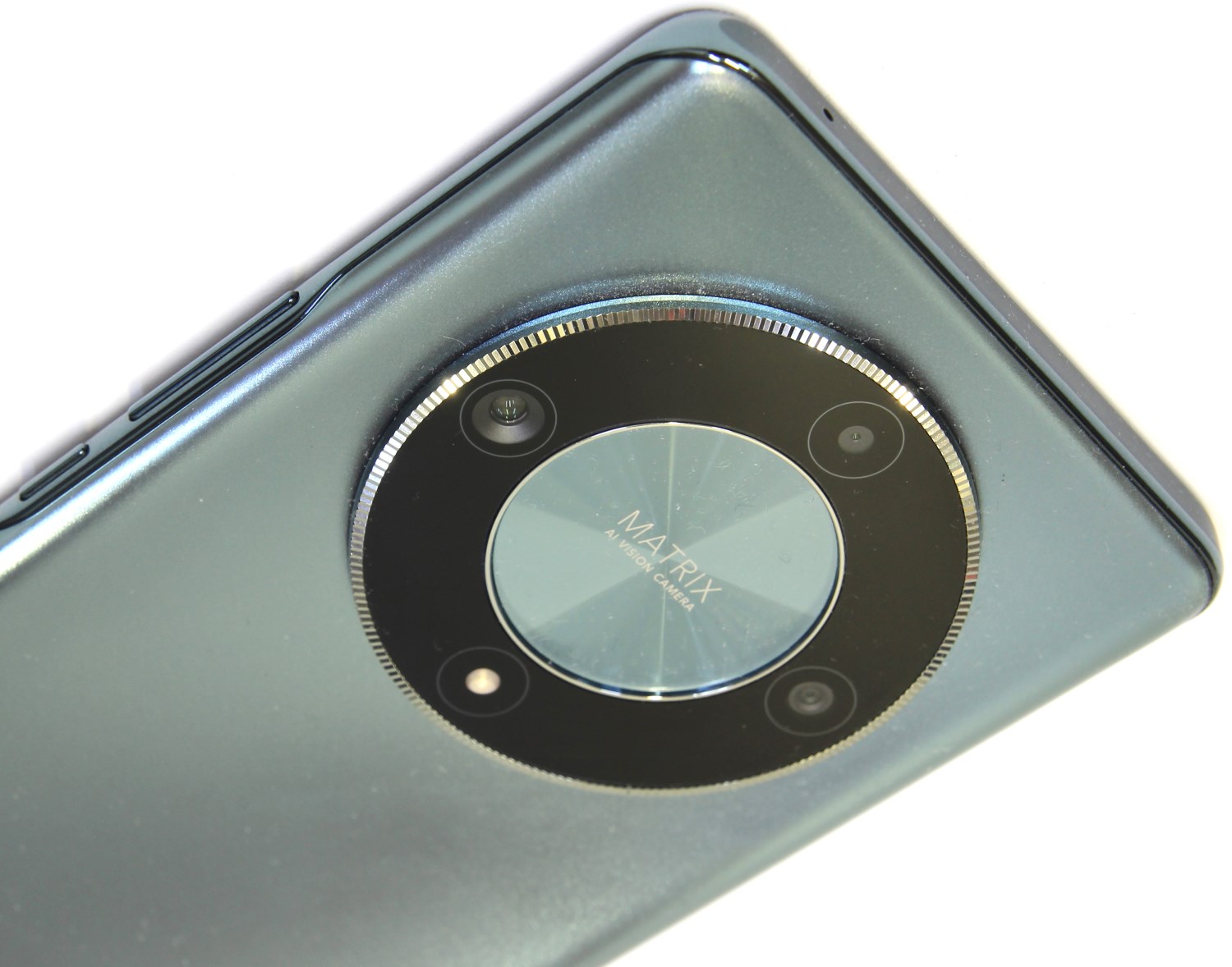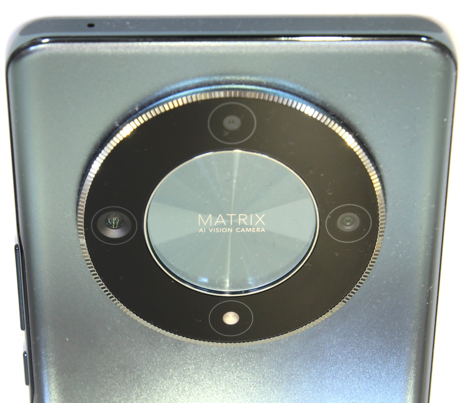 «Шайба» с камерами немного выступает над корпусом, но если надеть чехол, то она будет с ним заподлицо. Внутри этого чёрного кольца находится кружок, покрашенный в основной цвет корпуса. На нём есть надпись: MATRIX AI vision camera. Сверху, слева и справа находятся модули камер, а в нижней расположен светодиод вспышки. Не самое удобное расположение, особенно при использовании фонарика.