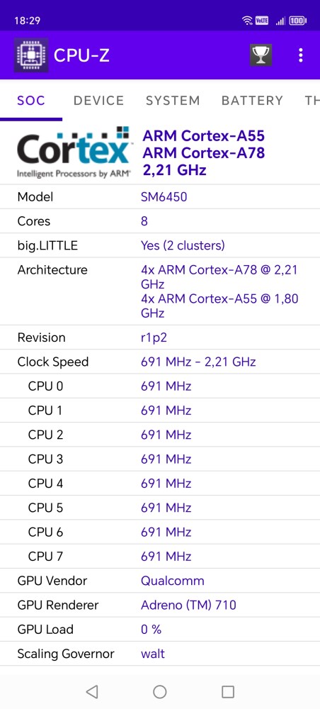 В современных сложных архитектурах производителям приходится изощряться и выпускать платформы с гетерогенными ядрами. В смартфонах такое уже практикуется давно потому, что очень важную роль играет портативность. Поэтому нет никаких чудес в том, что 4 ядра здесь работают на частоте 2,2ГГц и ещё четыре на 1,8 ГГц. За обработку графики отвечает видеоядро Adreno 710, которое работает на частоте 800 МГц.