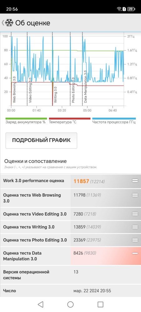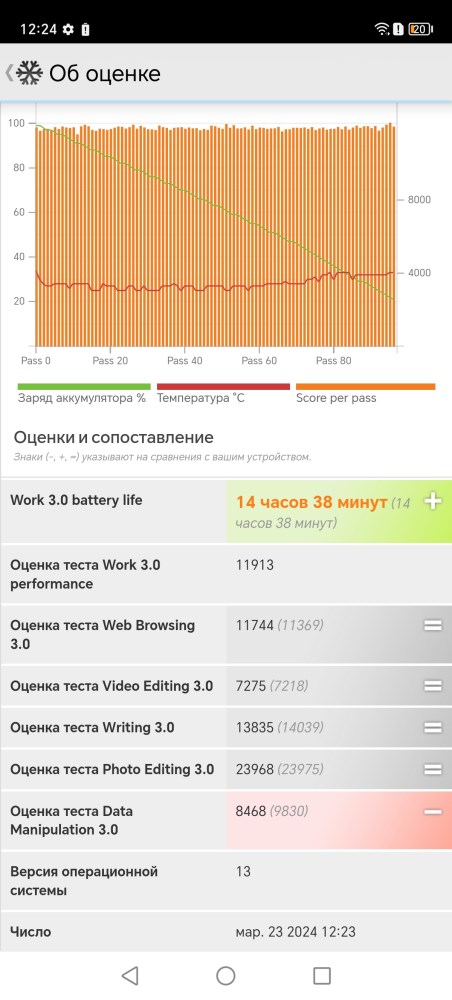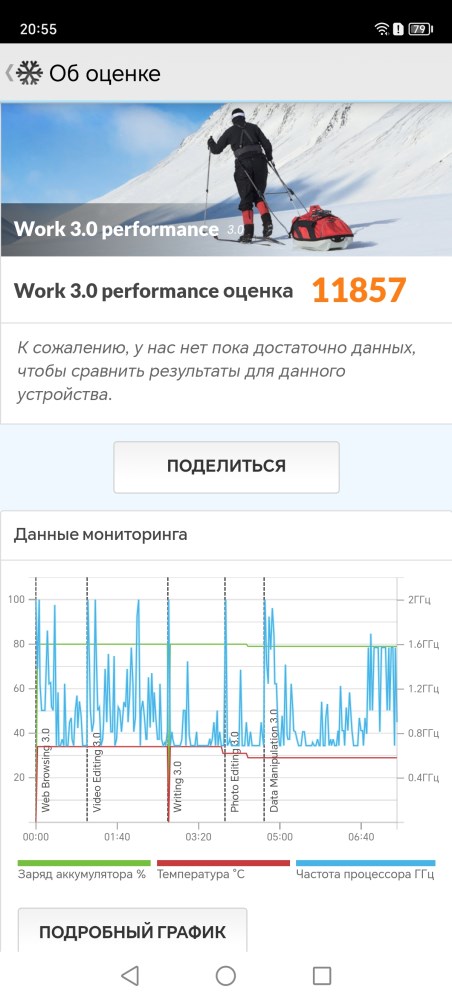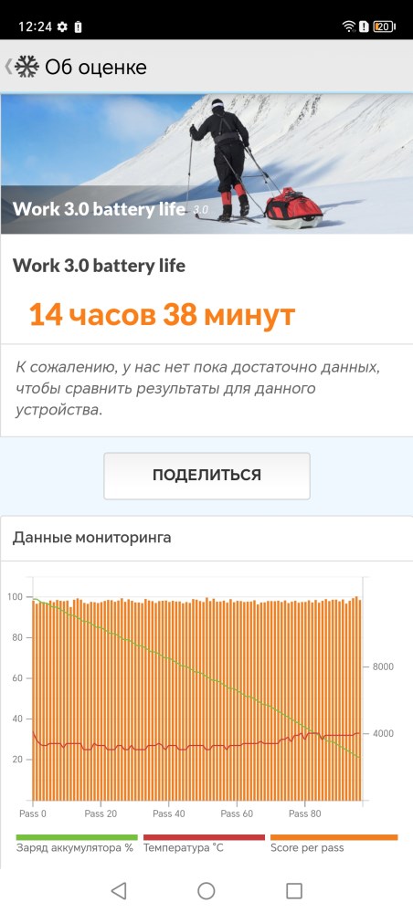 Когда речь идет о высоком уровне производительности, особенно в рамках ограниченных габаритов, неизменно встаёт вопрос уровня автономности. Ведь увеличение запаса энергии неизменно приводит к увеличению массогабаритных показателей. В данном случае, производитель предусмотрел встроенный аккумулятор, емкостью 5800 mAh. Это хороший показатель для современного устройства, но он вполне соответствует габаритам и весу модели. Потребителей здесь предостаточно – это восьмиядерный процессор и дисплей с высокой частотой обновления, который явно не способствуют экономии заряда. Посмотрим на результаты тестирования автономности. В качестве теста использовалось приложение PC Mark и тест Work 3.0 battery life.