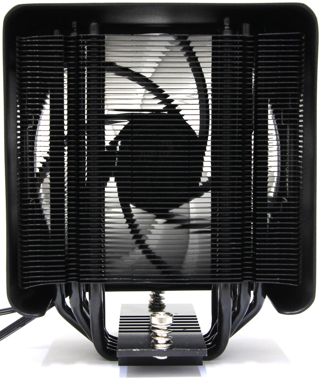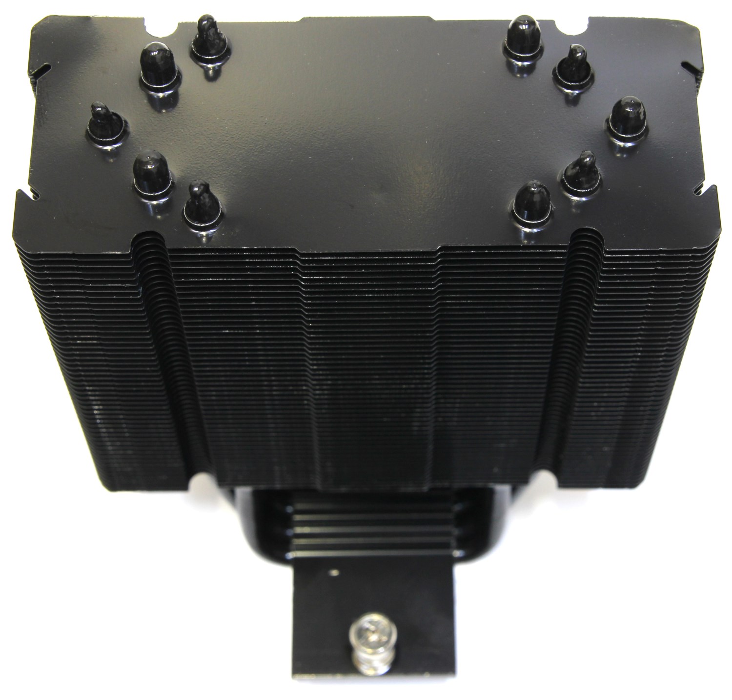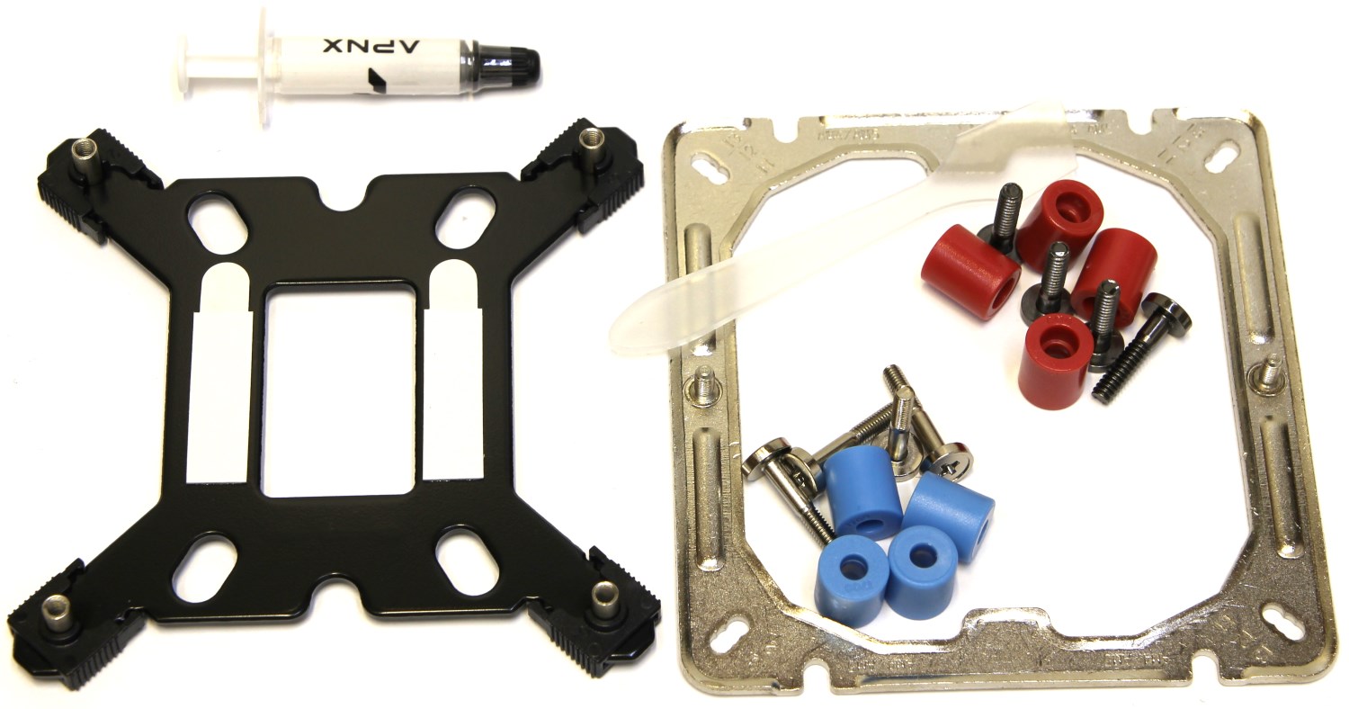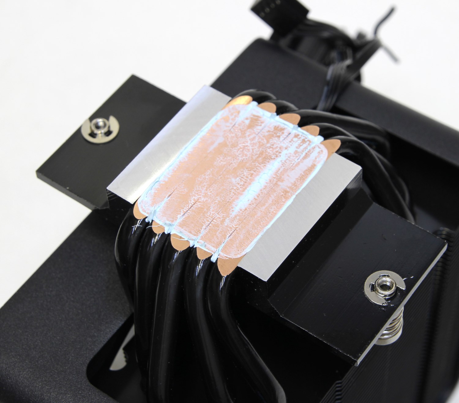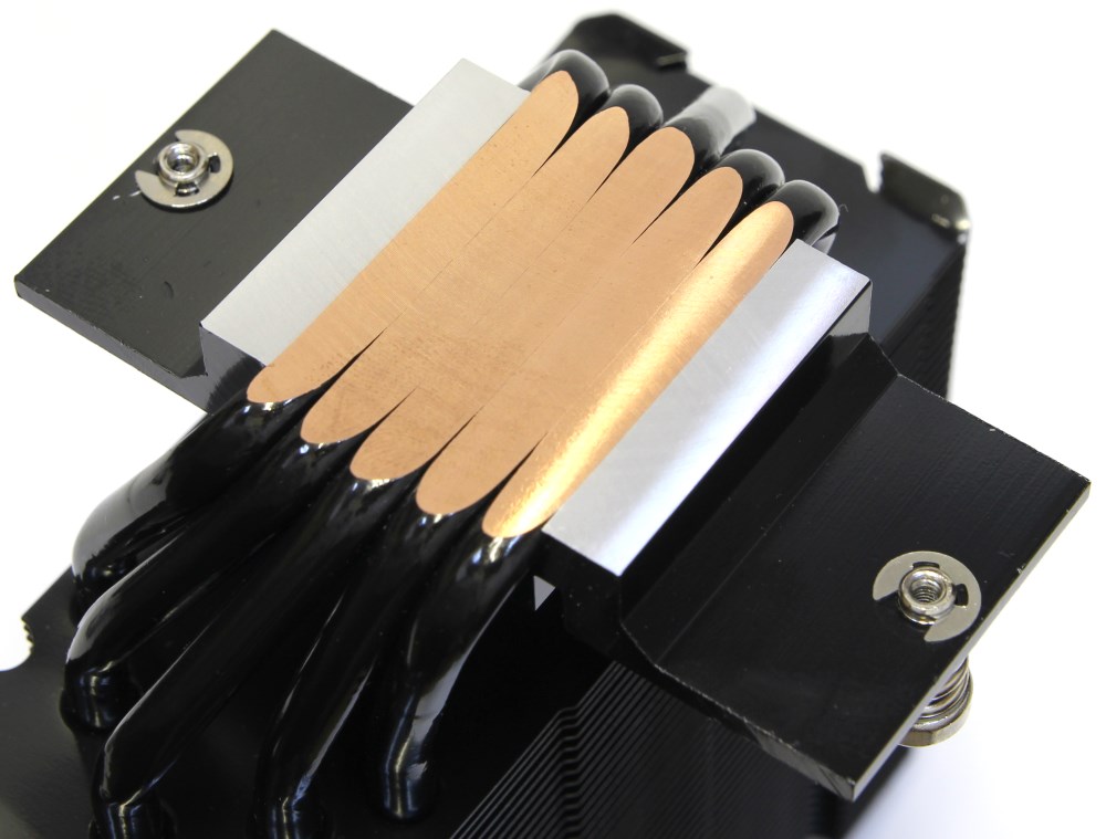 Внизу находится алюминиевое основание, в которое установлены пять медных тепловых трубок. Сверху расположена прижимная пластина с втулками на пружинках. Они вкручиваются в два резьбовых соединения на универсальной монтажной рамке.